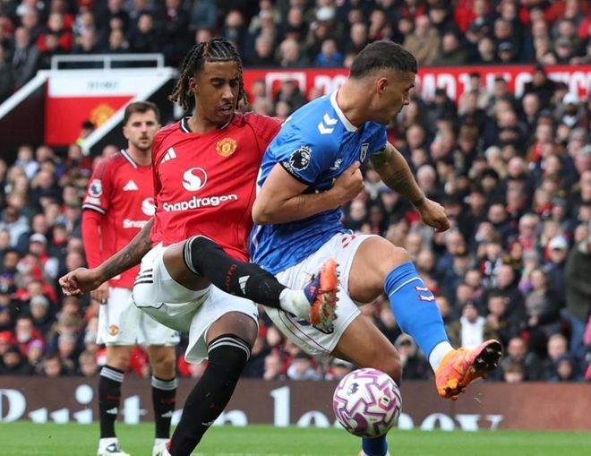 比赛刚刚开始8分钟,曼联就进球了!姆伯莫在右侧起球传中,禁区中路的芒特用左脚卸球,右脚直接凌空低射,皮球钻入球门右下角!芒特一停一射处理得太潇洒写意了!曼联取得梦幻般的开局。第21分钟,迪亚洛右侧带球内切兜射远角,被扑了出去。随后,姆伯莫的远射也是被门将化解了。4分钟后,布鲁诺-费尔南德斯远射中框,迪亚洛头球补射,顶偏了。