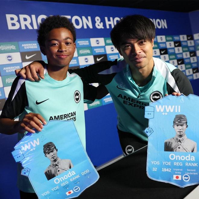 布莱顿青训学院在社媒平台发布的帖子中,三笘薫与一名青训球员手持印有日本士兵小野田宽郎的定制足球卡,此举旨在庆祝U12梯队赢得该项目资格,晋级比利时圣诞休战杯。