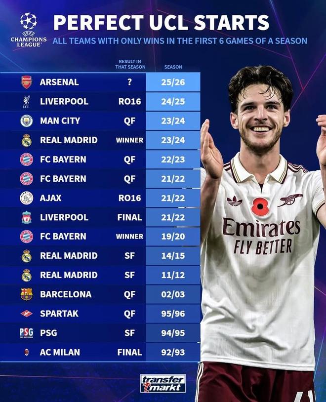 对此德转列出自欧冠1992年改制以来,所有单赛季前6战全胜球队最终的成绩。92年至今,欧冠共出现过15次有球队单赛季前6战全胜,其中只有2019-20赛季的拜仁以及2023-24赛季的皇马最终夺冠,1992-93赛季的米兰以及2021-22赛季的利物浦则是闯入了决赛。