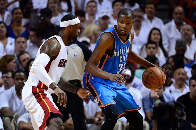 2012年总决赛,詹姆斯率领的热火击败杜兰特领衔的雷霆,拿下个人首冠,也给更年轻的杜兰特上了一课。