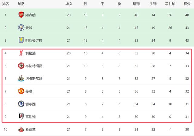 从目前来看,英超争四已经大乱,从第四的利物浦,到第九的富勒姆,这6支球队就差了3分。虽然利物浦还少赛1轮,但是他们将做客阿森纳,看起来也凶多吉少。本赛季,除了排名前三的球队之外,英超其他强队的表现,都很难让球迷满意。哪怕是夏窗斥巨资引援的利物浦,也很难保证赛季结束时,自己肯定能拿到第四名。接下来,英超争四将会更加激烈,大家认为谁能笑到最后呢!